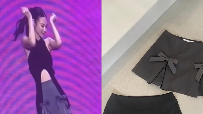 제니가 베트남 콘서트에서 착용한 귀여운 보우 스커트는 한국 디자이너 브랜드 '오드원아웃'의 제품입니다.
