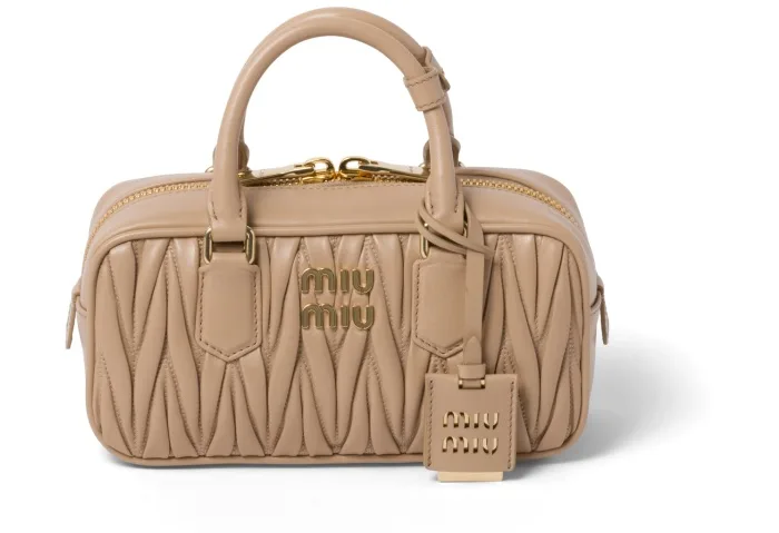 특별한 주름 디자인의 가죽 디퓨전 디테일은 미우미우의 아이코닉한 요소로 자리 잡았습니다! 밀키 틸 컬러의 '아카디' 스퀘어 백은 브랜드의 특별한 가죽 처리로 제작되어 소녀의 로맨틱하고 우아한 기질을 과시합니다.