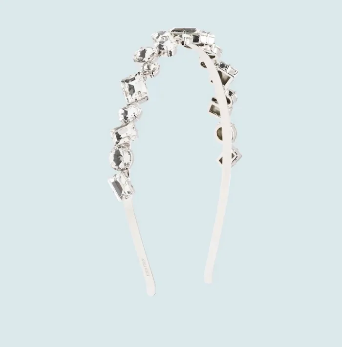 미우미우의 주얼리 같은 헤어 액세서리는 정사각형, 다이아몬드, 원형 모양의 크리스털이 반짝이는 마무리를 선사합니다. 집에서 평범한 티만 입고 있어도 이 헤어 액세서리를 사용하면 즉시 우아한 룩으로 변신할 수 있습니다.