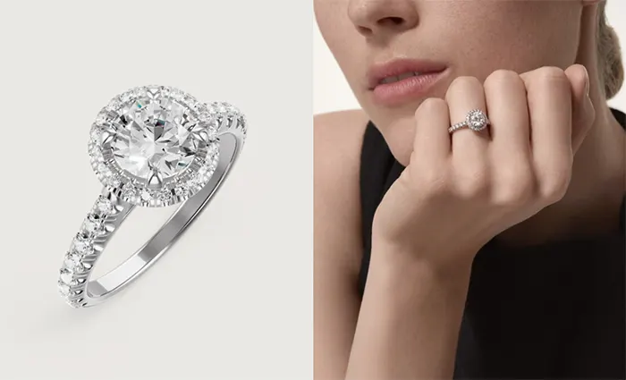 까르띠에 데스티 네 솔리테어 링은 중앙에 오버 사이즈 라운드 브릴리언트 다이아몬드와 측면에 작은 라운드 브릴리언트 다이아몬드가 원형으로 세팅되어 화려하고 우아하게 보입니다.