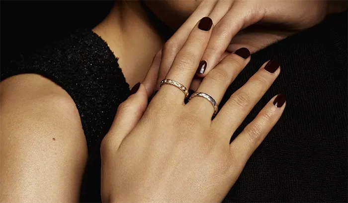 (왼쪽) 샤넬 코코 크러쉬 네로우 링, 18K 베이지 골드. (오른쪽) 약 0.36캐럿의 18개의 다이아몬드가 세팅된 18K 화이트 골드 코코 크러쉬 네로우 링.